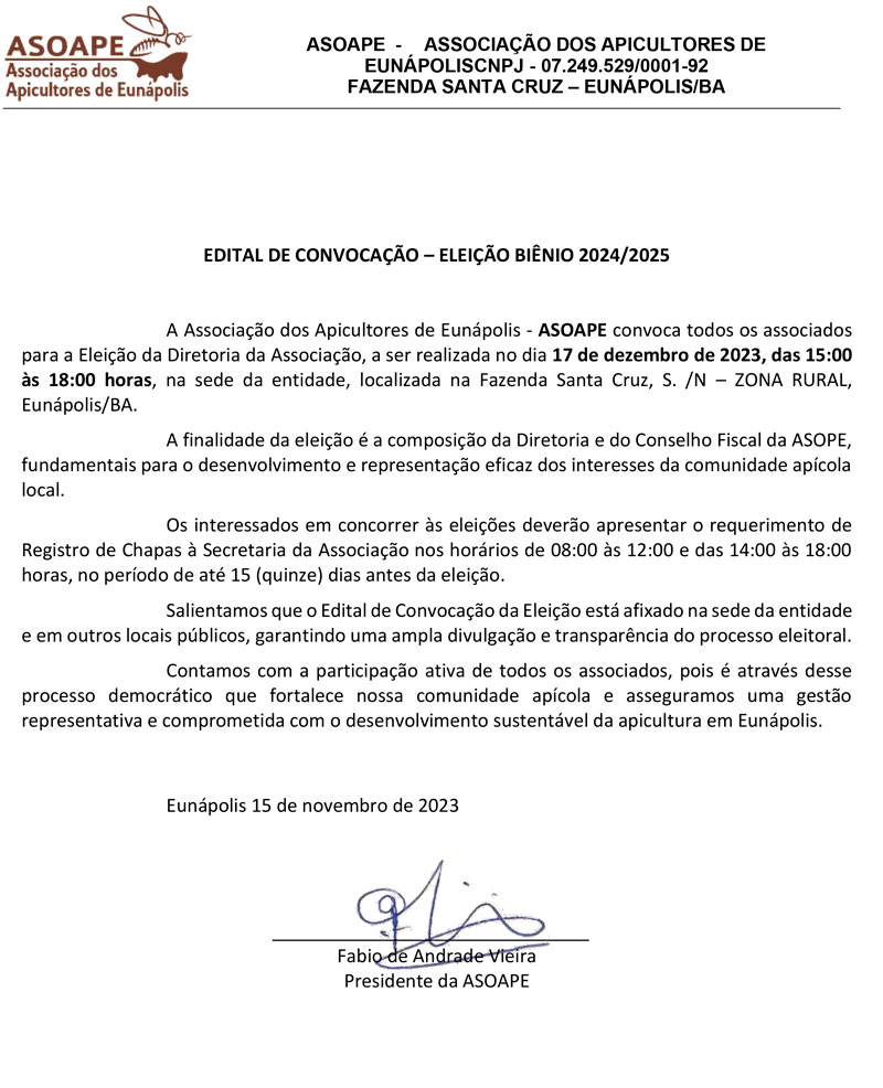 A Associação dos Apicultores de Eunápolis ASOAPE convoca todos os associados para a Eleição da Diretoria da Associação