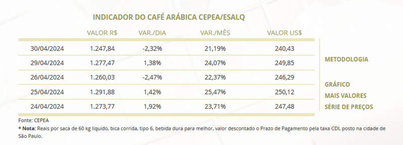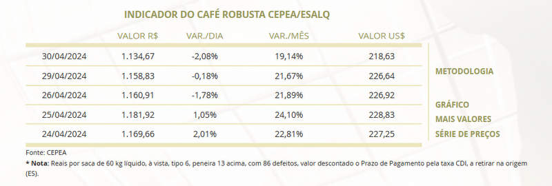O café robusta também experimentou uma redução em seu preço, com uma saca de 60kg sendo cotada a R$ 1.134,67 no Espírito Santo (ES).