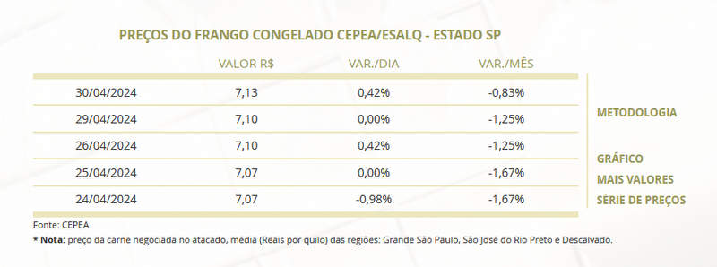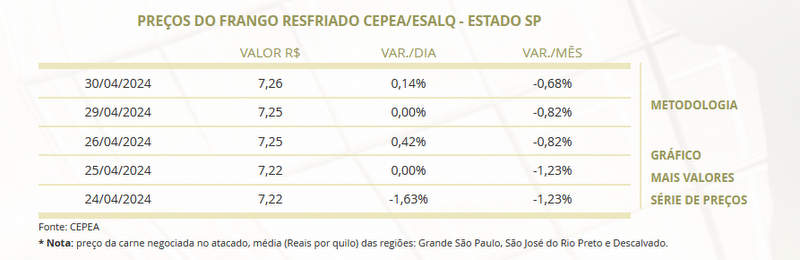 Enquanto isso, os preços do frango congelado e do frango resfriado estão em alta, registrando valores de R$ 7,13 e R$ 7,26 por quilo, respectivamente, para a região da Grande São Paulo, São José do Rio Preto e Descalvado. Essa tendência ascendente nos preços do frango pode ser influenciada por uma série de fatores, incluindo aumento da demanda, escassez de oferta ou custos de produção mais elevados.
