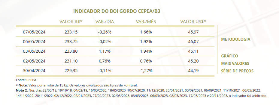 Nesta terça-feira (7), o mercado do boi gordo registrou uma leve queda de 0,02% em sua cotação, com a arroba de 15kg sendo negociada a R$ 233,75 no estado de São Paulo. Essa diminuição mínima pode refletir ajustes pontuais no mercado, mas não indica necessariamente uma tendência de baixa significativa.