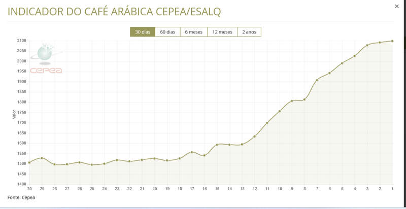 Sexta-feira (29/11), o mercado cafeeiro segue em alta, com a saca de 60 quilos do café arábica sendo negociada a R$ 2.098,06 na cidade de São Paulo, o que representa um acréscimo de 0,35% em relação à última cotação. O café robusta também apresentou valorização significativa, com alta de 0,98%, alcançando R$ 1.784,02.