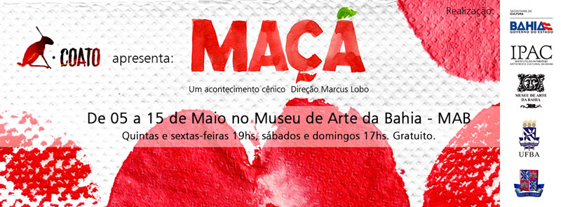 O Museu de Arte da Bahia inaugura no dia 5 de maio, às 19h, o Laboratório de Experimentação Estética idealizado pelo diretor do MAB, Pedro Arcanjo. Para a inauguração será apresentado o acontecimento cênico "Maçã", produzido pelos artistas do COATO e dirigido pelo aluno-diretor da Escola de Teatro da UFBA, Marcus Lobo. A entrada é franqueada ao público com idade mínima de 16 anos.