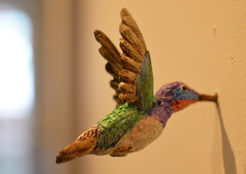 A instalação “10 Hummingbirds” é composta por dez beija-flores, também em bronze policromado com tintas iridescentes, com tonalidades diferentes, fincados na parede pelo longo bico. Na escultura de um cisne negro, em bronze pintado com tinta acrílica, o artista foi buscar na memória fabular dos contos de Andersen o simbolismo do cisne que se transforma em princesa.