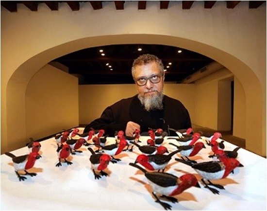 Entre as obras expostas por Efrain consta a instalação “Uma coisa linda”, com 150 pássaros da espécie galos-de-campina, feitos em bronze policromado, distribuídos pelo piso da sala em grupos de unidades variáveis, formando uma cartografia determinada pelo artista.