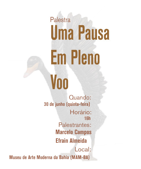 Finalizando o Ciclo de Palestras sobre a exposição “Uma Pausa em Pleno Voo”, do artista cearense Efrain Almeida, o Museu de Arte Moderna da Bahia (MAM-BA) promove um bate-papo sobre o encerramento da mostra, ministrado pelo curador da exposição Marcelo Campos e o artista Efrain Almeida, no dia 30 de junho (quinta-feira), às 16h, na Galeria 3 do MAM-BA.