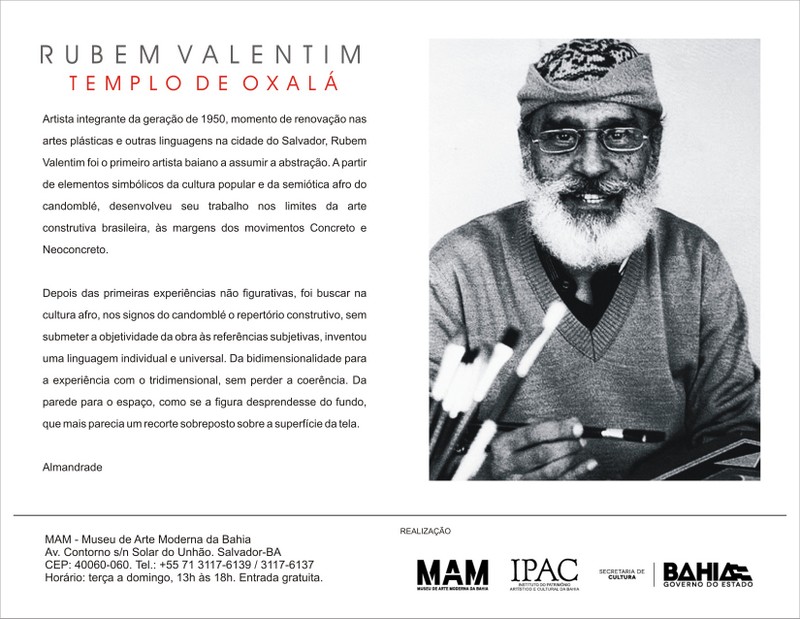 O Museu de Arte Moderna da Bahia (MAM-BA) inaugura a exposição Templo de Oxalá, desta vez, na Capela do museu. A mostra terá abertura no dia 28 de julho às 19h e permanecerá até 11 de setembro aberta aos visitantes de terça a domingo das 13h às 18h.