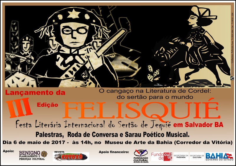 Salvador recebe convidados em evento de divulgação da Festa Literária Internacional do Sertão de Jequié – Felisquié, no dia 06 de maio de 2017, com atividades das 14 às 18:30hs, no Museu de Arte da Bahia, na Avenida Sete de Setembro, 2440, Corredor da Vitória. O evento é gratuito e não há necessidade de inscrição prévia.