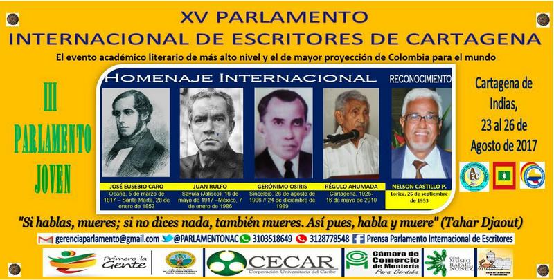 O XV Parlamento Internacional de Escritores da Colômbia atualmente tem delegados por toda a Colômbia e diversos países, e é o evento acadêmico e literário de maior qualidade, maior atração entre os intelectuais do país e que realiza a maior projeção de Cartagena para o mundo. Declarado como de “Interesse Cultural” pelo Conselho de Cultura do Distrito de Cartagena, é cofinanciado pelo Instituto de Patrimônio e Cultura de Cartagena, Ministério da Cultura, Câmara de Comércio de Montería, Corporação Universitária do Caribe (CECAR), Instituição Tecnológica “Colégio Mayor de Bolívar”, Teatro Adolfo Mejía, assessoria da Cara de Cultura de Cartagena, Restaurante Las Indias Boutique Gormet, Casa Museo “Rafael Nuñez”, dentre outros.
