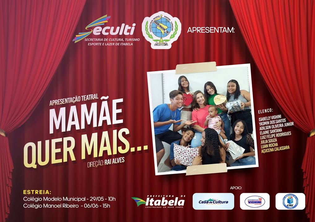 A peça "MAMÃE QUER MAIS..." acontece nesta quarta-feira dia 29/5 às 10h00 no Colégio Municipal em Itabela, e dia 06 de junho às 15h00 no Colégio Municipal Manuel Carneiro Ribeiro, em Monte Pascoal, para professores e alunos.