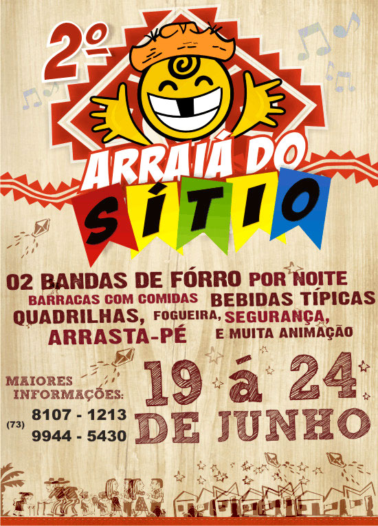 Não esqueça de 19 á 24 de junho tem o 2º Arraia do Sítio. Maiores informações através dos telefones (73) 8107 – 1213 ou 9956 – 8484.