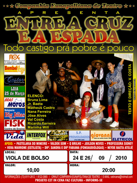 A peça, cujo texto é de uma publicação do Cordel - as famosas revistinhas de versos simples, produzidas aqui no Nordeste, que eram vendidas penduradas em extensas e finas cordas, daí o nome “cordel” -, foi adaptada pelo diretor Valdemir Costa, mais conhecido na cidade como Val, e encenada pela Companhia Eunapolitana de Teatro.