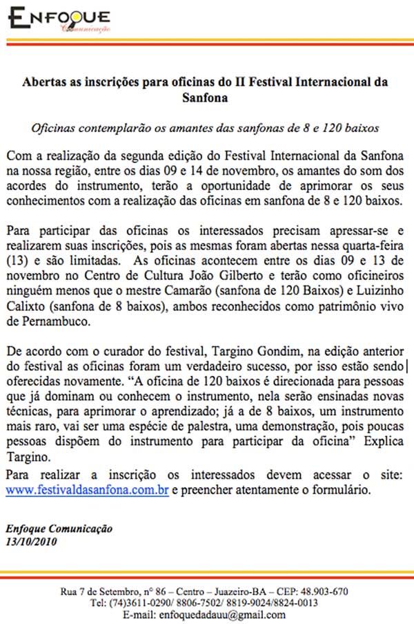 Abertas as inscrições para as oficinas II Festival Intenacional da Sanfona