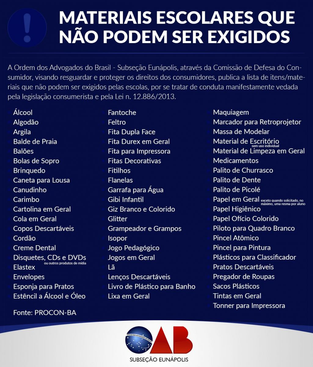 Porém as reclamações foram sendo feitas e foram acumulando nos balcões de reclamações, até que a OAB entrou na jogada e o PROCOM-BA tomou medidas drásticas em relação ao assunto, o rota51.com recebeu da OAB através do seu Presidente Dr. Alex Ornelas a lista que a escola “não pode pedir” para nenhum pai, por ser a referida lista, de responsabilidade da escola, ou seja, a escola só pode pedir a lista individual, a lista coletiva é de responsabilidade da escola, veja a lista abaixo: