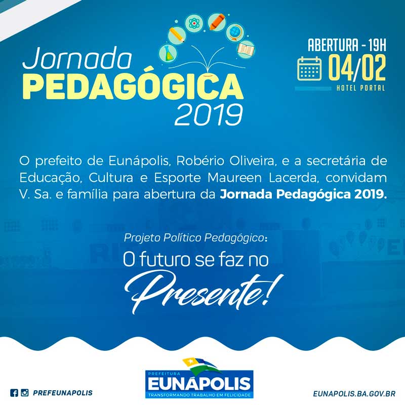 Com o tema “Projeto Político Pedagógico: O futuro se faz no presente”, a Prefeitura de Eunápolis, por meio da Secretaria de Educação, Cultura e Esporte, realizará nesta segunda-feira, 04/02, a abertura da Jornada Pedagógica 2019, que acontecerá no Auditório do Hotel Portal, às 19h.