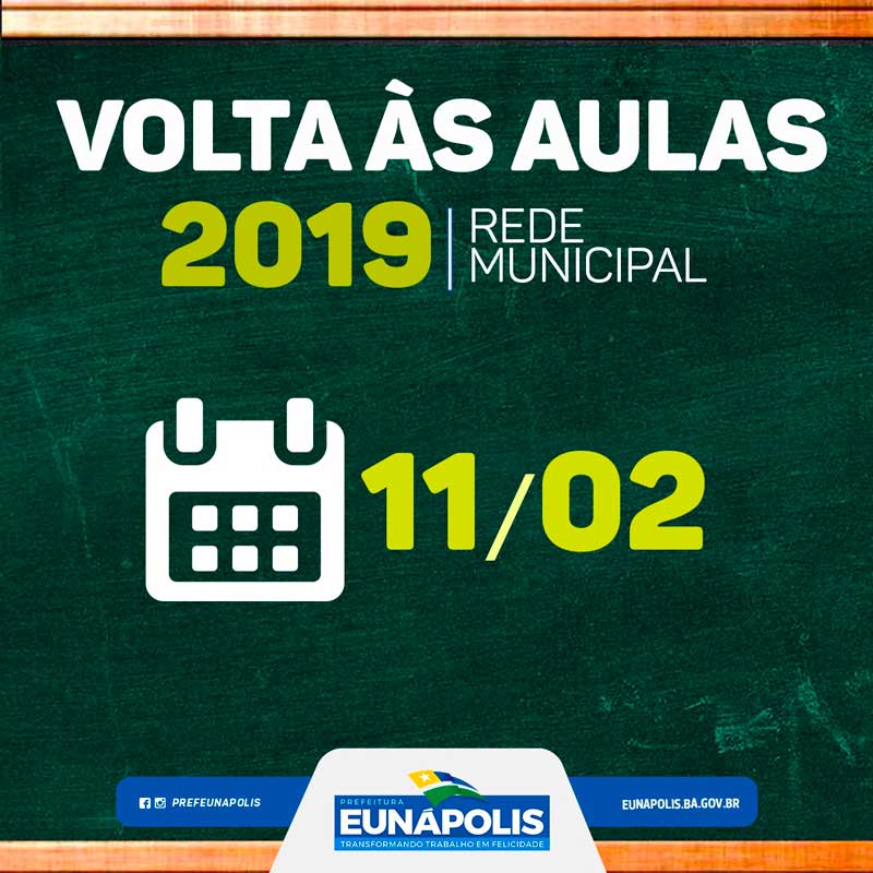 Alunos da rede municipal de Eunápolis iniciarão nesta segunda-feira (11/02) o ano letivo 2019. As escolas municipais receberão os quase 20 mil estudantes eunapolitanos que terão mais um ano letivo com professores qualificados, transporte gratuito na sede e na zona rural e merenda escolar de qualidade.