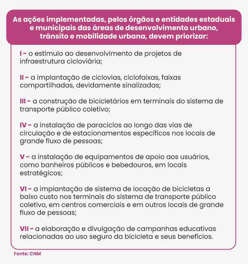 Segundo a norma, as ações implementadas pelas entidades estaduais e municipais devem priorizar o estímulo ao desenvolvimento de projetos de infraestrutura cicloviárias, construção de bicicletários em terminas do transporte público coletivo, instalação de paraciclos e estacionamentos específicos nos locais de grande fluxo de pessoas, equipamentos de apoio aos usuários – como banheiros e bebedouros –, sistema de locação de bicicletas a baixo custo em locais estratégicos, além da elaboração e divulgação de campanha que estimulem o uso seguro da bicicleta.