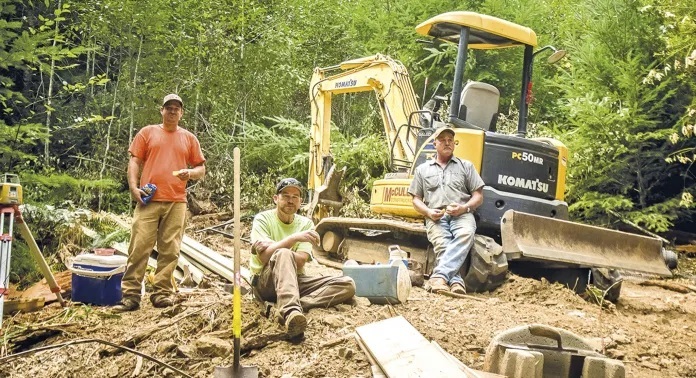 Equipe de construção de uma das novas pontes para as bicicletas na trilha Paradise Royale.