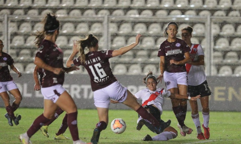 O gramado pesado e irregular devido à chuva prejudicou as duas equipes, que acumularam passes errados. A primeira oportunidade do primeiro tempo veio aos 38 minutos. Após cruzamento de Carol Tavares pela direita, a zaga do River falhou e a também meia Patrícia Sochor dominou livre, próxima à marca do pênalti, mas chutou muito fraco, em cima da goleira Florencia Chiribelo. Na segunda chance, porém, as brasileiras não desperdiçaram. Aos 44 minutos, Sochor bateu falta na área pela esquerda e Ana Alice apareceu às costas da defesa, sem marcação, para abrir o placar.