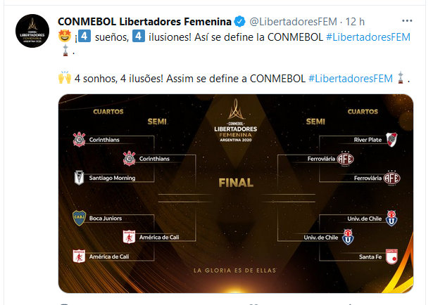 A outra semifinal, que ocorre nesta quarta-feira (17), em horário que ainda será confirmado pela Conmebol, também terá o reencontro de times que se enfrentaram na fase de grupos: Corinthians e América de Cali (Colômbia). Na terceira rodada do Grupo A, o Timão venceu por 3 a 0. Nas quartas, as alvinegras atropelaram o Santiago Morning (Chile) por 7 a 0. Já as colombianas se garantiram ao superarem o Boca Juniors (Argentina) por 2 a 1.