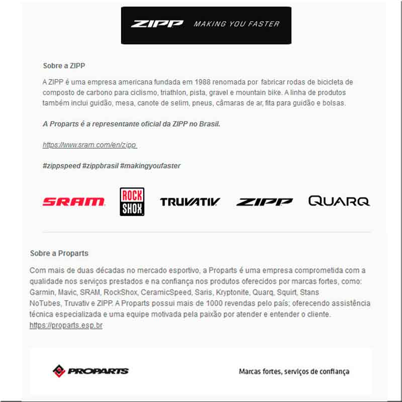 A Zipp está de volta ao Brasil com muitas novidades, representada oficialmente pela Proparts, que oferece produtos de qualidade e serviços de confiança há quase três décadas no país.