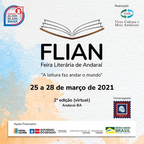 "A Flian - Feira Literária de Andaraí é uma realização da Viver Cultura e Meio Ambiente e tem apoio financeiro do Estado da Bahia através da Secretaria de Cultura e da Fundação Pedro Calmon (Programa Aldir Blanc Bahia) via Lei Aldir Blanc, direcionada pela Secretaria Especial da Cultura do Ministério do Turismo, Governo Federal”.