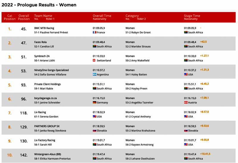 Lill e Strauss (Faces Rola) terminaram em 2º, e Wakefield & Luthi (Symbtech ZA) fecharam o pódio feminino neste primeiro dia de corrida.
