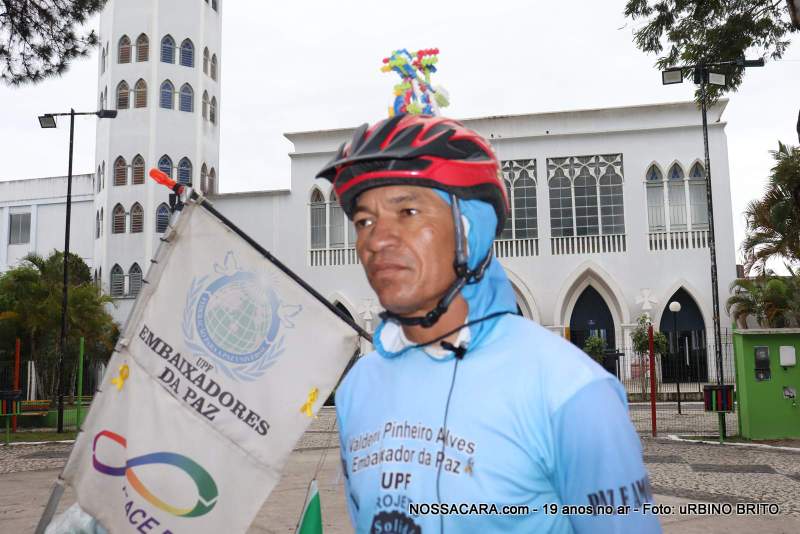 Ele é Valdeni Pinheiro Alves, ciclista, que saiu do Amazonas, e vem pedalando pelo Brasil todo e, nesta caminhada por ser embaixador da paz, ele também faz uma campanha denominada, “porjeto pão solidário”.