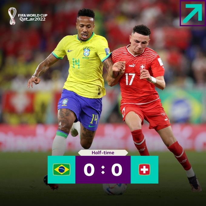 Paquetá cruzou uma bola na pequena área aos 18 minutos, que Elvedi cortou antes de chegar em Richarlison. A fama de ferrolho suíço, criada há mais de 70 anos, fez sentido no confronto desta segunda, pois a equipe europeia se defendeu com nove jogadores durante toda a etapa inicial. A não ser aos 26 minutos, quando o lançamento de Raphinha foi certeiro para Vinícius Júnior, sozinho, pegar de primeira. Foi o primeiro chute a gol do Brasil, e Sommer colocou para escanteio.