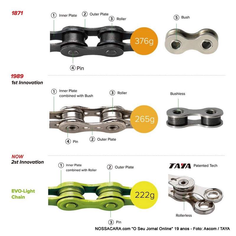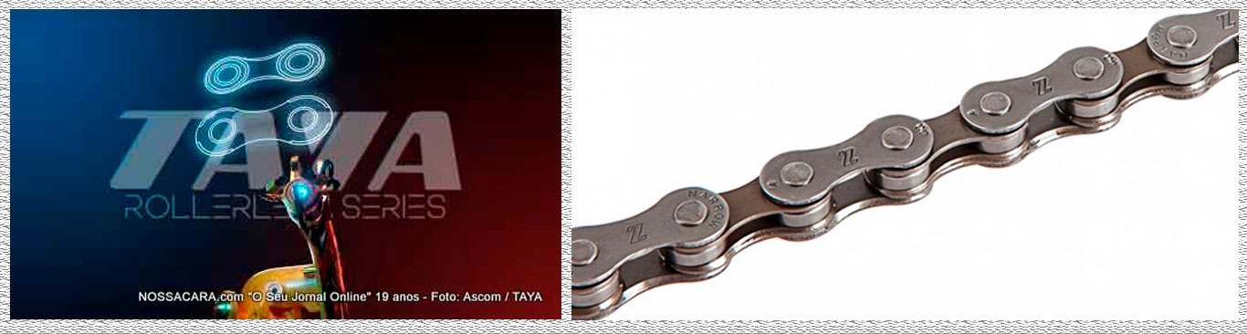 Com a SÉRIE ROLLERLESS, a TAYA corajosamente removeu os roletes da corrente, o que significa que existem apenas três partes numa corrente. A marca Taiwanesa afirma que esta construção exclusiva resulta numa corrente mais leve, silenciosa, duradoura e eficiente. Bem como um maior intervalo entre lubrificações.