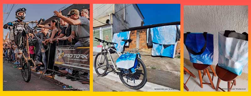“Em parceria com a Shimano, recebemos as lonas que seriam descartadas após o evento e desenvolvemos o projeto das ecobags e alforges para bikes. Capacitamos nossas costureiras e conseguimos criar uma ação social e sustentável, que auxilia o meio ambiente por meio do descarte correto e reaproveitamento de material ao mesmo tempo que gera oportunidades para a comunidade por meio de renda e possibilidade de trabalho”, explica Carlos Leandro de Oliveira, conhecido como Carlos Greenbike, fundador e presidente da Associação Pedala Queimados, que desde 2015 atua na região periférica do Rio de Janeiro com “a finalidade de transformá-la numa cidade mais humana, justa, igualitária e sustentável. Com o sucesso do projeto, poderá ser um modelo a ser expandido para outros municípios da região metropolitana do Rio”.