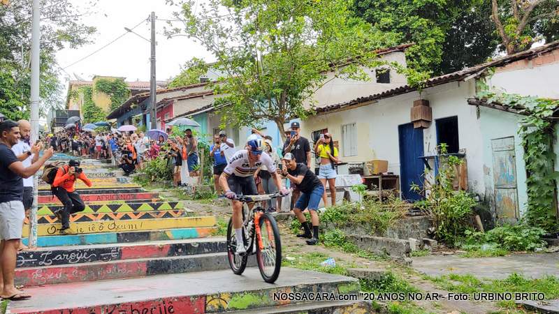 Fãs - A largada aconteceu às 10h, mas 1 hora antes, os entusiastas do MTB já se organizavam em locais estratégicos para acompanhar os atletas. Lucas Patrick Mendes Medeiros, de 27 anos, é padeiro e veio de Porteirinha (MG), cidade a 740km de Porto Seguro, somente para ver os seus ídolos do ciclismo: ‘Avança’ e Cainã Oliveira. “É a primeira vez que venho e cheguei vendo o ‘Avança’ no treino da escadaria. Já deu uma emoção. Vim com alguns amigos só pra ver esta competição. Olha ali o Hans Becking”, anunciou.