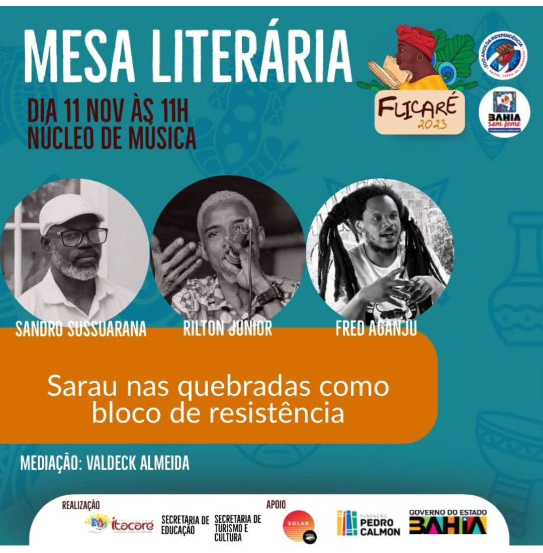 Salvador, Cachoeira e Itacaré - A quebrada está em festa! E não é para menos, pois a cena poética marginal da Bahia está prestes a bombar como nunca antes. Diretamente dos centros de produção cultural e literária, três poetas da pesada se unem para representar a cultura das quebradas como nunca antes visto. Fred Aganju, Rilton Junior e Sandro Sussuarana são os caras que vão causar um terremoto literário na primeira edição da Flicaré - Festa Literária de Itacaré, dia 11 de novembro, às 11hs, na mesa Sarau nas Quebradas como bloco de resistência, mediada pelo poeta e jornalista Valdeck Almeida de Jesus.