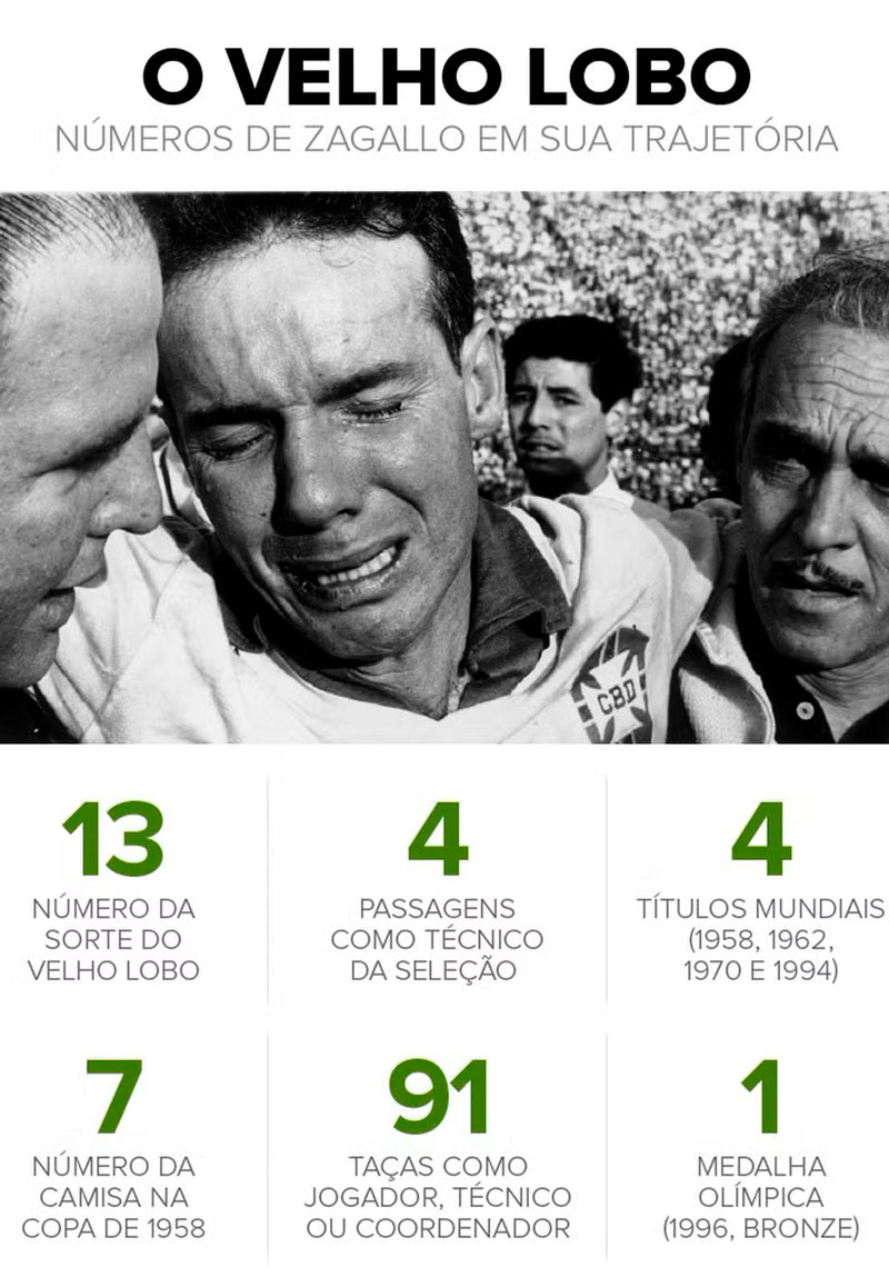 Morreu às 23h40 desta sexta-feira, aos 92 anos, Mario Jorge Lobo Zagallo, um dos grandes nomes da história do futebol mundial e única pessoa a estar presente em quatro títulos de Copa do Mundo: em 1958 e 1962, como jogador, em 1970, como técnico, e em 1994, como coordenador técnico.