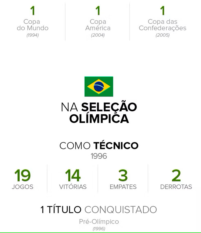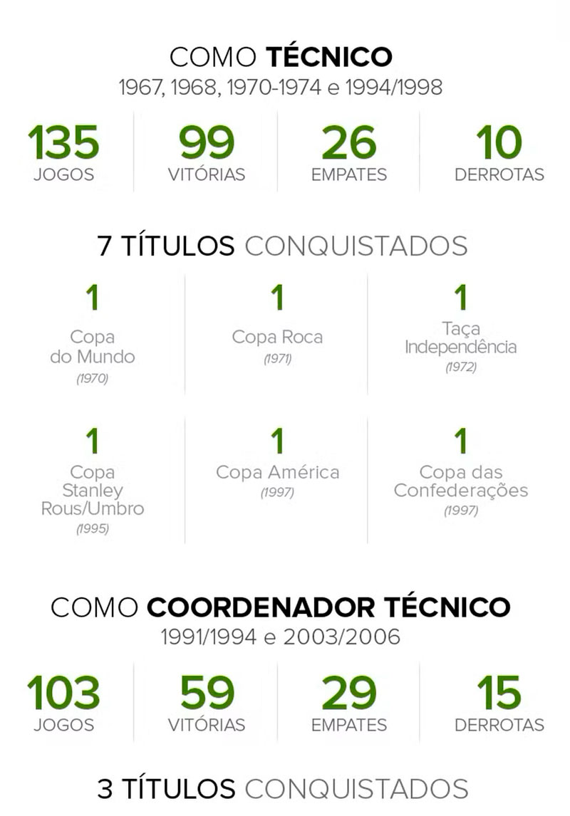 Ele ainda esteve no comando da Seleção em 1974 (quarto lugar) e 1998 (vice-campeão), além de ter sido novamente coordenador em 2006.