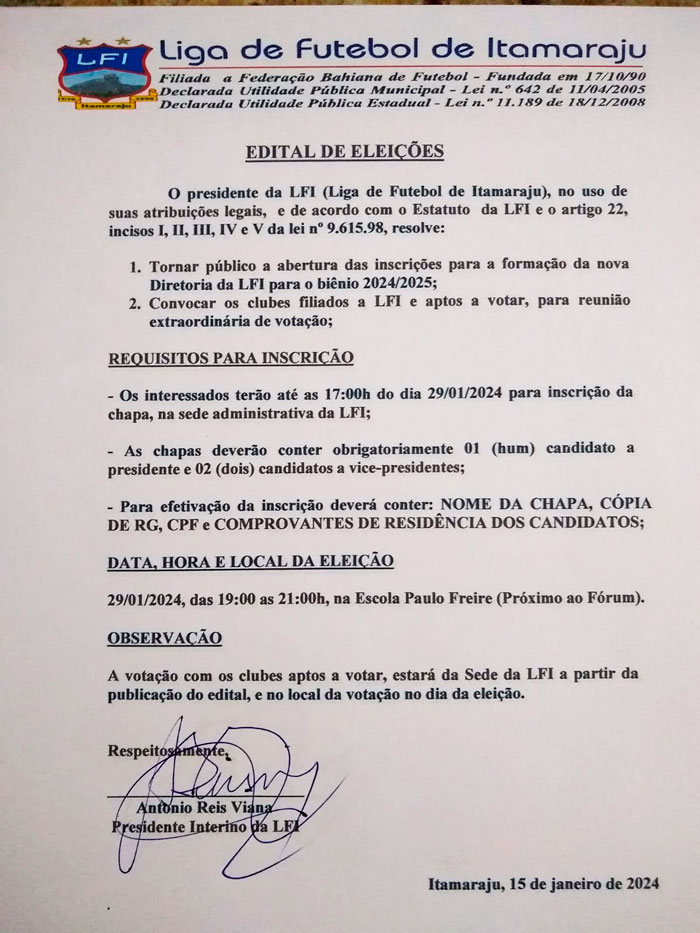 A Liga de Futebol de Itamaraju, através da diretoria em exercício divulgou por meio de redes sociais e veículos de comunicação, edital de convocação para nova eleição de diretoria da instituição esportiva.