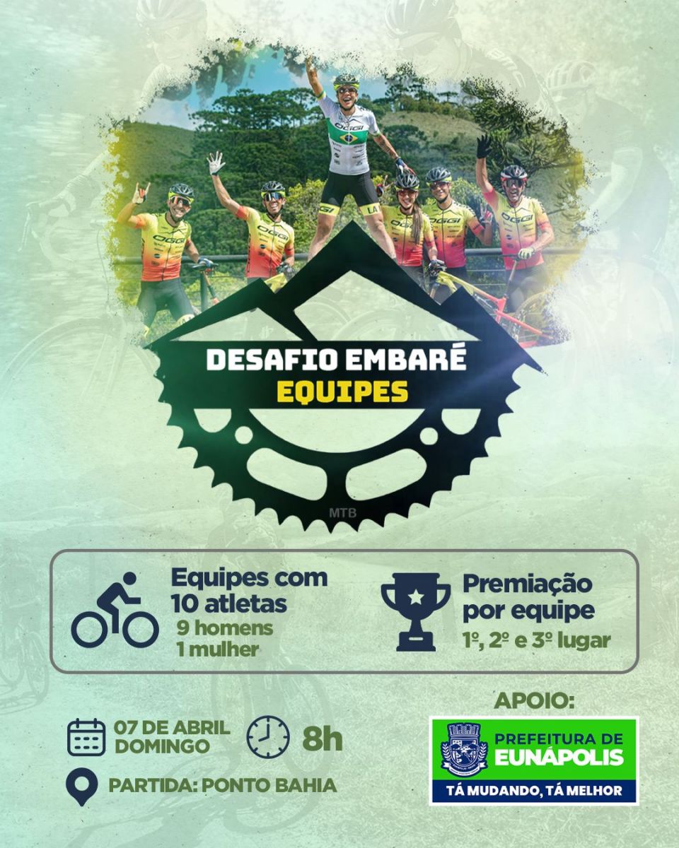 No domingo, 7, acontece em Eunápolis o Desafio Embaré, uma prova ciclística com diversas equipes de 10 pessoas (no mínimo uma mulher em cada equipe) e um percurso de 70 quilômetros. A Prefeitura de Eunápolis apoia o evento que ocorre no Dia Mundial da Saúde e ajuda a incentivar a prática de atividade física no município.