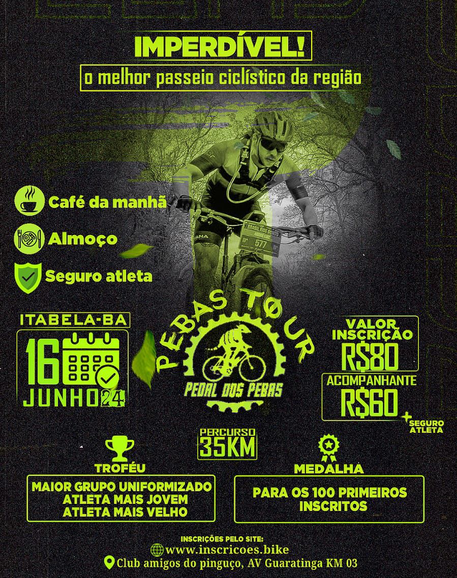 Eunápolis (26/04) - Preparem-se para uma jornada emocionante sobre duas rodas! O grupo Pedal dos Pebas está organizando o primeiro Passeio Ciclístico Pebas Tour, marcado para o dia 16/06/2024, na encantadora cidade de Itabela, localizada na Região Extremo Sul da Bahia. Neste evento imperdível, os integrantes da equipe ciclística, conhecidos como PEDAL DOS PEBAS, se unem para proporcionar uma experiência única aos apaixonados por ciclismo. Com o apoio de empresários, proprietários de fazendas e a comunidade local, o Passeio Ciclístico promete ser um dia repleto de diversão, aventura e camaradagem. Junte-se a nós e seja parte dessa história pedalando pelas belas paisagens de Itabela.