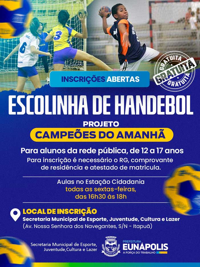 A Prefeitura de Eunápolis, por meio da Secretaria de Esportes, Cultura, Juventude e Lazer, abriu inscrições para as aulas gratuitas de handebol voltadas a adolescentes de 12 a 17 anos, nos gêneros masculino e feminino. As atividades serão realizadas na Estação Cidadania, todas as sextas-feiras, das 16h30 às 18h, com acompanhamento de profissionais qualificados.