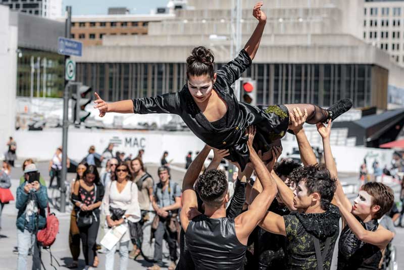 Trupe é uma homenagem aos artistas mambembes, que atravessam territórios por ruas e praças, desde tempos imemoriais. “Trupe acontece em forma de um cortejo, em que as pessoas são surpreendidas quando estão passando pelo lugar. A ideia é modificar a paisagem ao redor e os próprios sentidos do espectador”, propõe o diretor Alex Neoral. A performance foi apresentada antes na Espanha, em Madri, na Casa de Vacas, em 2023, quando a companhia foi convidada do Festival Hola Rio. Antes, no Canadá, integrou a programação do Festival Quartiers Danses, em Montreal.