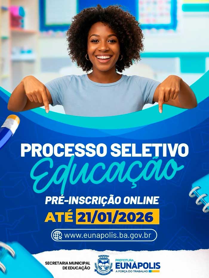A Prefeitura de Eunápolis publicou os Editais dos Processos Seletivos Simplificados (PSS) nº 002/2026 e nº 003/2026, voltados à contratação temporária de profissionais da Educação, com o objetivo de assegurar a continuidade das aulas, o funcionamento pleno das unidades escolares e o planejamento adequado do ano letivo da rede municipal.