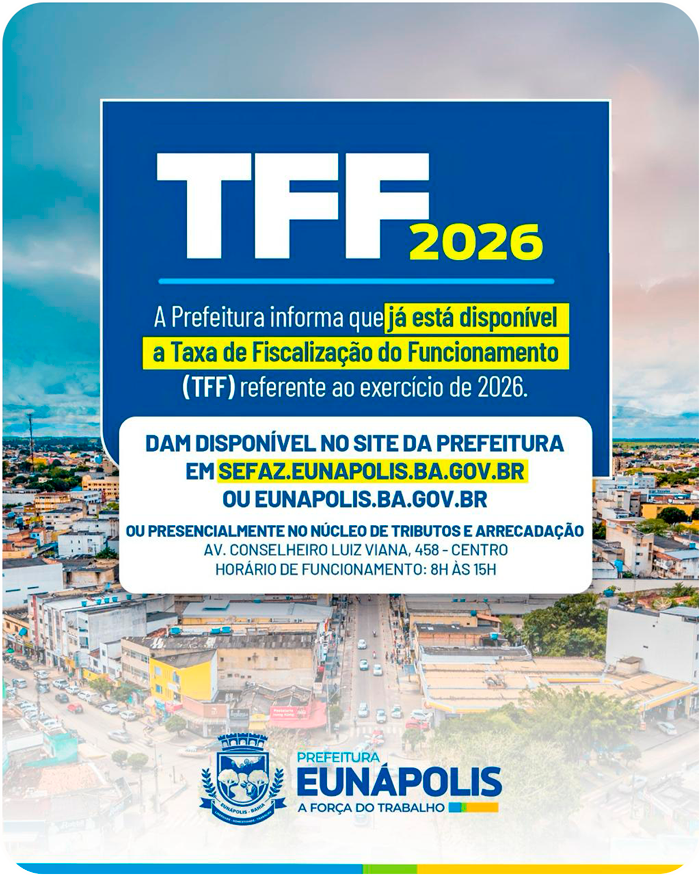 A Prefeitura de Eunápolis, por meio do Núcleo Municipal de Tributos e Arrecadação, informa que a Taxa de Fiscalização e Funcionamento (TFF) 2026 já está disponível para pagamento. O tributo deve ser quitado por empresas, comércios, indústrias, prestadores de serviços e profissionais autônomos que exercem atividades econômicas no município. O prazo para pagamento é até o dia 30 de abril.