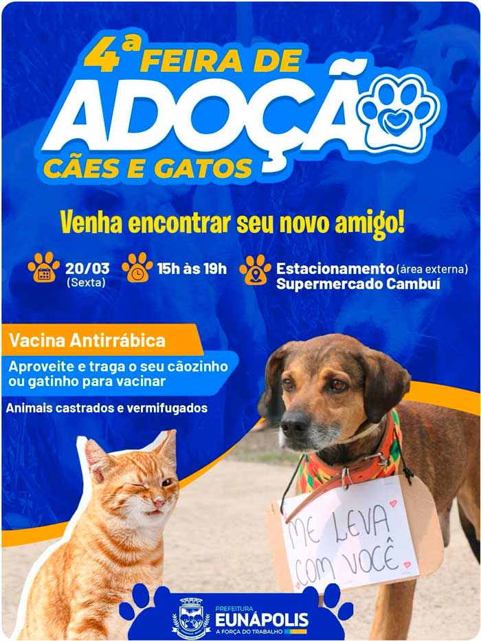 A Prefeitura de Eunápolis por meio da Unidade de Vigilância de Zoonoses (UVZ) promove, nesta sexta-feira (20/03), a 4ª Feira de Adoção de Animais. A ação será realizada das 15h às 19h, no estacionamento externo do Supermercado Cambuí, com acesso aberto ao público.