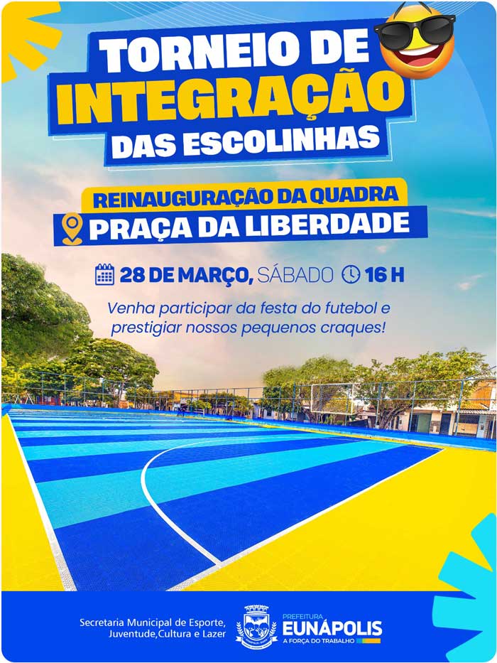 A Prefeitura de Eunápolis realiza, neste sábado (28/03), a partir das 16h, a reinauguração da quadra da Praça da Liberdade, que passou por uma requalificação completa para melhor atender a comunidade. Para marcar a entrega do espaço, será promovido um torneio de integração das escolinhas de futebol, reunindo atletas infantis e suas famílias em um momento de integração e incentivo ao esporte.
