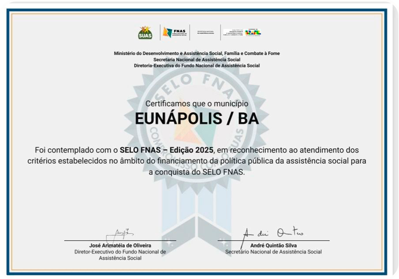 A Prefeitura de Eunápolis alcançou um importante reconhecimento nacional ao ser contemplada com o Selo de Qualidade da Gestão Financeira do SUAS – Edição 2025, concedido pelo Fundo Nacional de Assistência Social (FNAS). A certificação destaca municípios que se sobressaem na gestão responsável, transparente e eficiente dos recursos públicos destinados à assistência social.