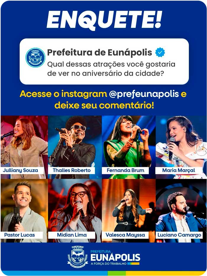Prefeitura de Eunápolis lança enquete no Instagram @prefeunapolis para definir atrações para o aniversário da cidade