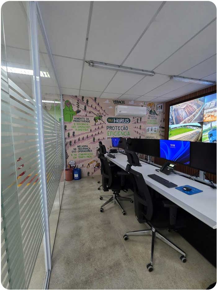 A Sala de Controle Hórus centraliza o monitoramento em tempo real das atividades florestais, reunindo dados operacionais, indicadores de desempenho e alertas de desvios em uma única plataforma. A partir desse ambiente integrado, equipes especializadas acompanham a operação, identificam gargalos e podem acionar rapidamente planos de resposta estruturados, com o objetivo de reduzir perdas e aumentar a previsibilidade das operações.
