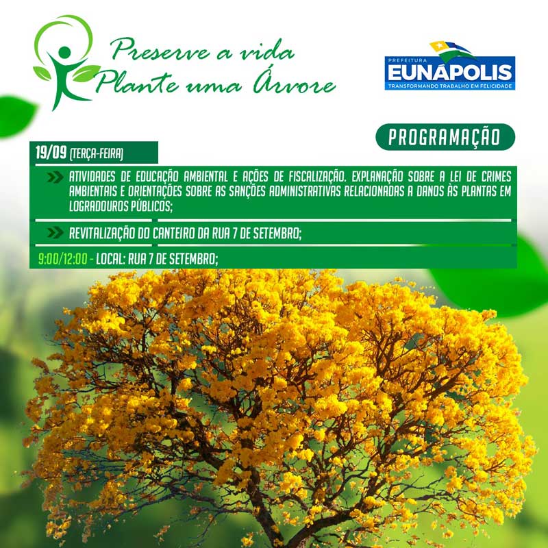 Nesta segunda-feira, 18/09, a Secretaria de Meio Ambiente da Prefeitura de Eunápolis iniciou as programações da Semana das Árvores com um ciclo de palestras educativas nas Escolas do Município. Com o tema ‘Preserve a vida. Plante uma Árvore’, a Semana seguirá até o dia 22/09 com atividades de exposição e orientação sobre arborização, concurso cultural nas escolas municipais, separação de resíduos recicláveis, fiscalização ambiental, plantio de mudas, entre outras ações.