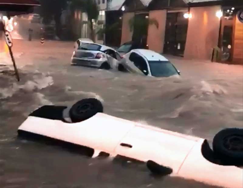 Motoristas ficaram presos dentro de carros durante a enxurrada.