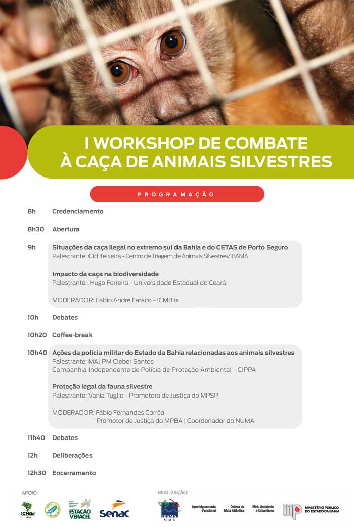 Práticas contra animais silvestres na região tem gerado preocupação do Ministério Público da Bahia, conforme o coordenador do Núcleo de Defesa da Mata Atlântica (Numa), o promotor de justiça Fábio Fernandes Corrêa. “Temos recebido várias informações do aumento da caça de animais silvestres na região de Porto Seguro. A partir desse evento, nossa intenção é reunir alguns especialistas sobre o tema para discussão sobre os aspectos legais, técnicos e traçar uma estratégia de ordem tanto preventiva, quanto repressiva”, detalhou.