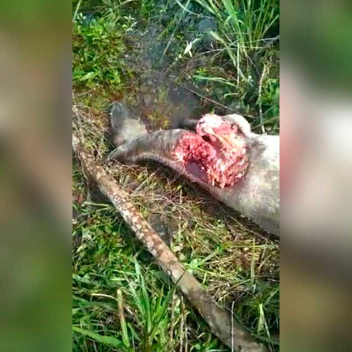 As imagens mostram o equino já morto após ter sido atacado à beira de uma estrada e arrastado para dentro do mato. As mordidas da suposta onça concentraram-se no lado direito, na parte superior da pata dianteira.
